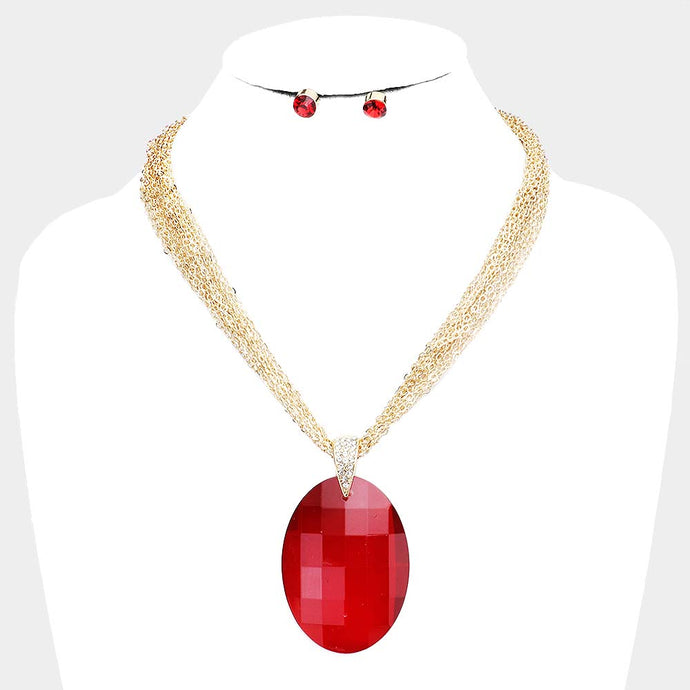Layered Metal Chain Oval Glass Stone Necklace Set