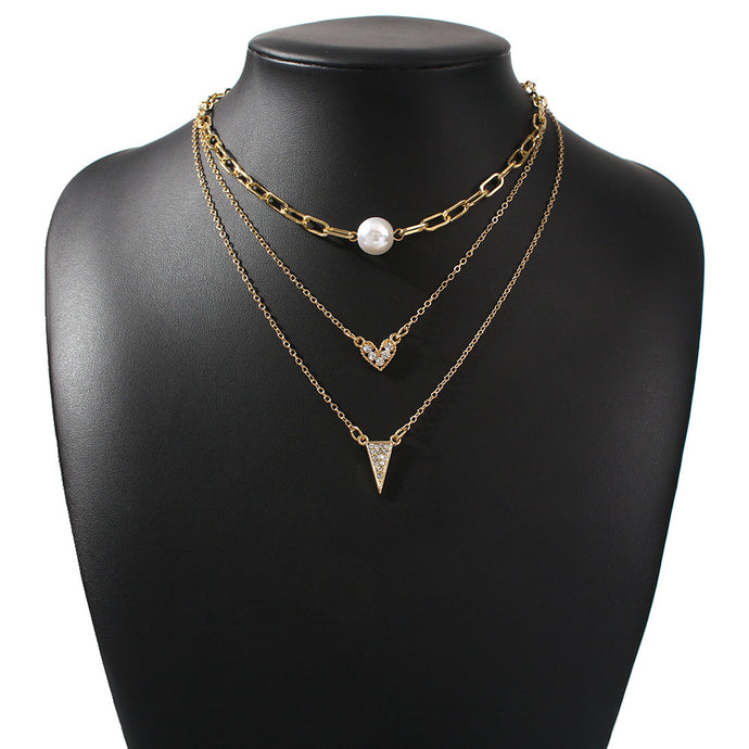 Multilayer Triangle Diamond Necklace Fashion Multilayer Pearl Pendant Clavicle Chain