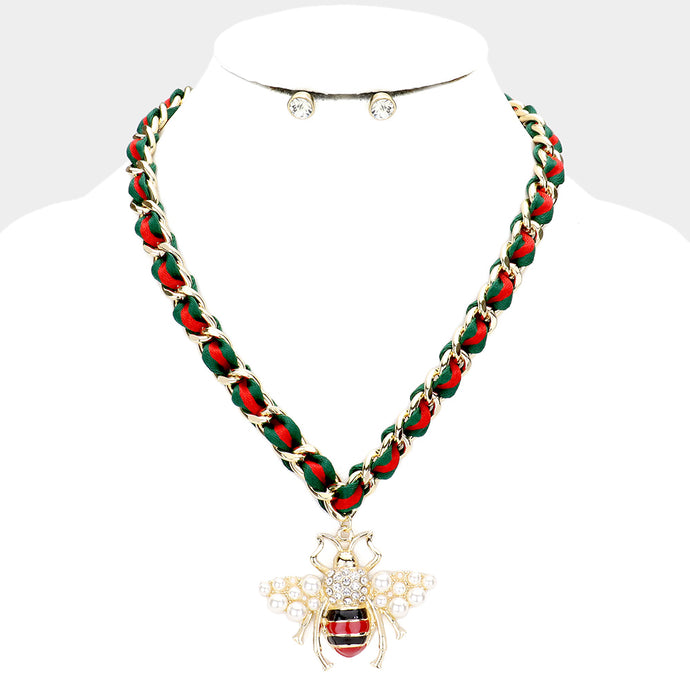 Pearl Honey Bee Pendant Color Block Fabric Metal Chain Necklace