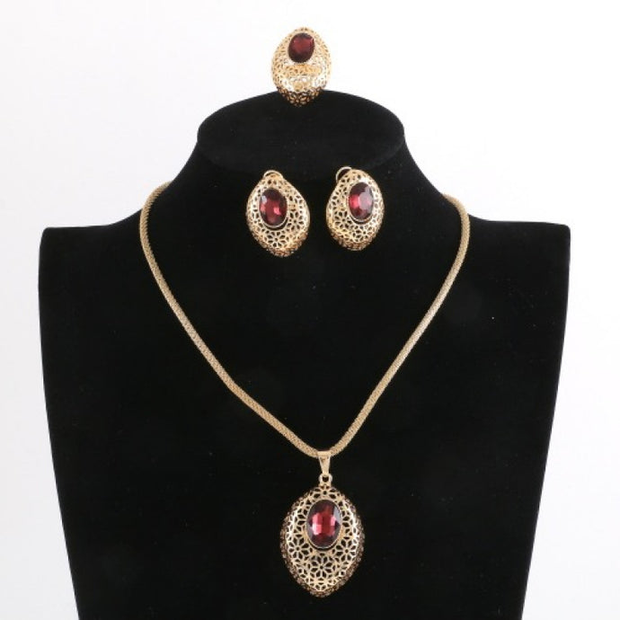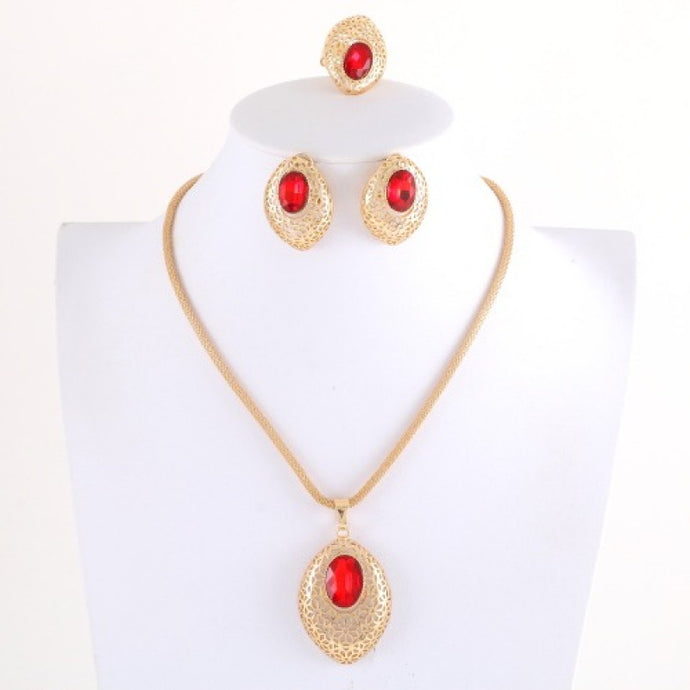 Gold Plated Metal Crystal Necklace Earring Set -Red